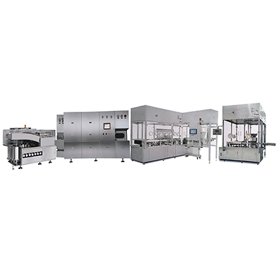 本聯動線沮由QCK系列立式超聲波洗瓶機、GMS系列隧道式滅菌干燥機、ABGZ系列罐裝加塞機、KGL系列軋蓋機四臺單機組成。毎臺吋單機使用,也可聯動生產,聯動生產時可完成噴淋水、超聲波清洗、機械手夾瓶、翻轉瓶、沖水(瓶內、外)、沖氣(瓶內、外)、 預熱、烘干滅菌、去熱源、冷卻、(前沖氮)、灌裝、(后沖氮)、理塞、壓寒、理蓋、軋蓋等二十多個工序,主要用于制藥廠抗生素瓶水針劑和凍干粉針劑的生產。